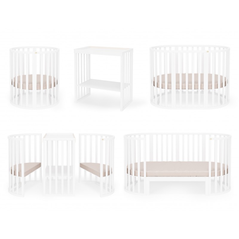 - Трансформира се в кръгла люлка за новородени, пълноценно креватче, кошара, диван