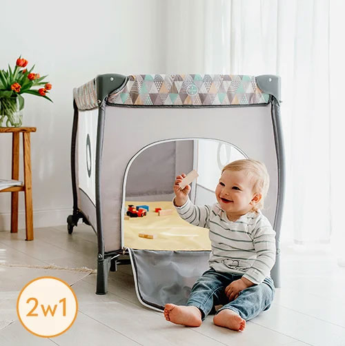 Детето може да остане близо до родителите по време на ежедневните дейности в дома. Леката конструкция и две колелца улесняват преместването на модела, докато мрежестите страни осигуряват зрителен контакт с детето и осигуряват оптимална въздушна циркулация.