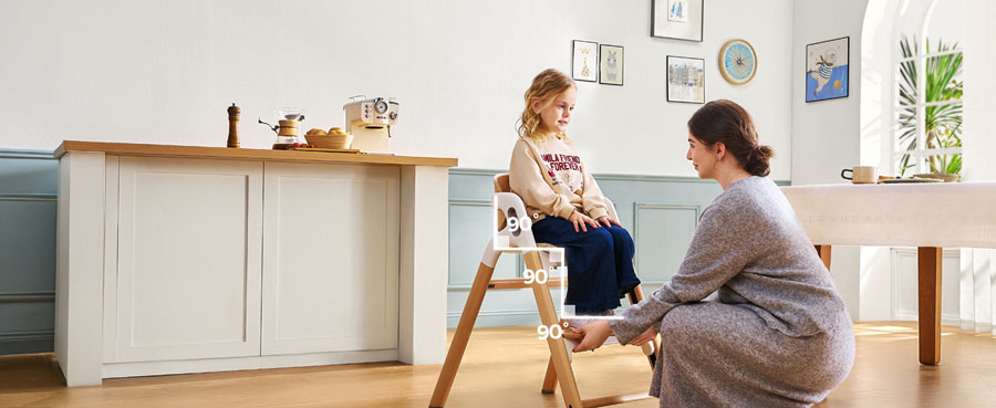 Регулируемата дълбочина на седалката (2 позиции) и поставката за крачета с 7 нива подпомагат правилен 90-градусов ъгъл в коленете за стабилно седене и изправяне.