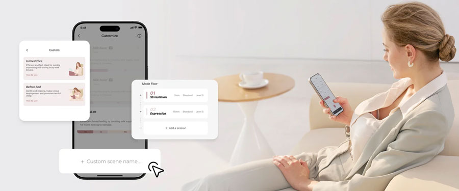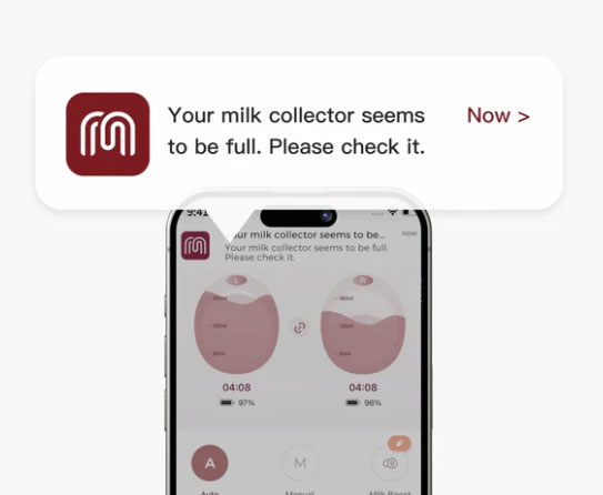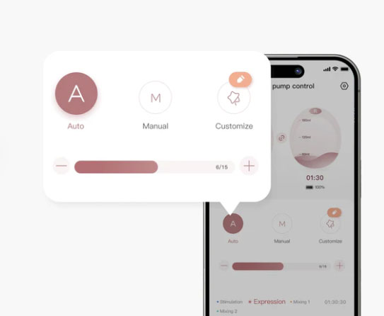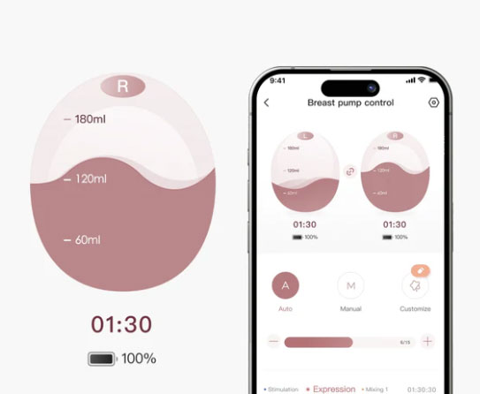 Свързва се с приложението Momcozy за автоматична смяна на режимите, проследяване в реално време на количеството кърма и известия при запълване на контейнера.
