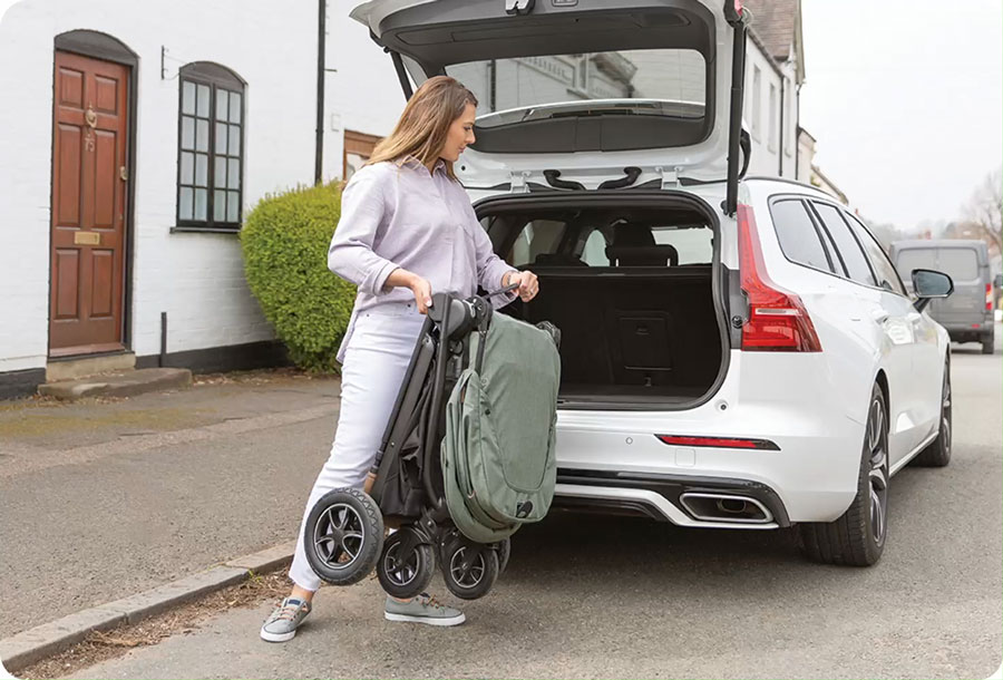 Бързо и лесно сгъване за удобно съхранение и транспортиране. Закрепете ключалката така, че количката да стои самостоятелно свободно – идеална е за прибиране в малки пространства!