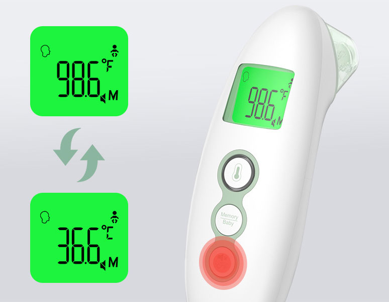 Този термометър от медицински клас позволява измерване както на температурата на челото, така и в ухото, осигурявайки удобство при употреба. Освен това може да измерва температурата на предмети и на околната среда, което го прави изключително универсален. Лесно можете да превключвате между различните режими според нуждите си.